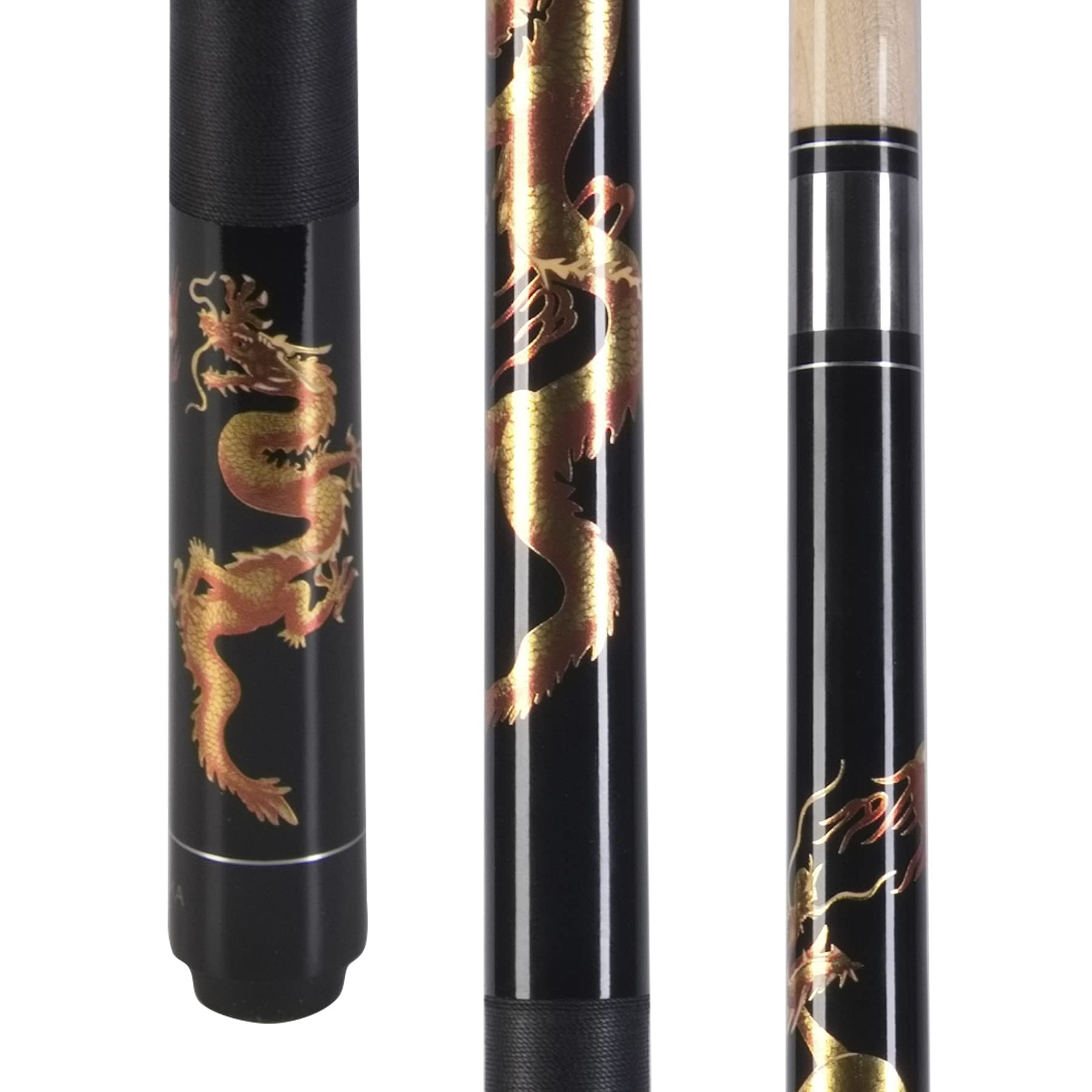 - Striking Golden Dragon Design Bold golden dragon artwork on a deep black cue creates a powerful and unique look on any billiards table. A standout cue stick that adds personality to your game room, bar, or pool hall.